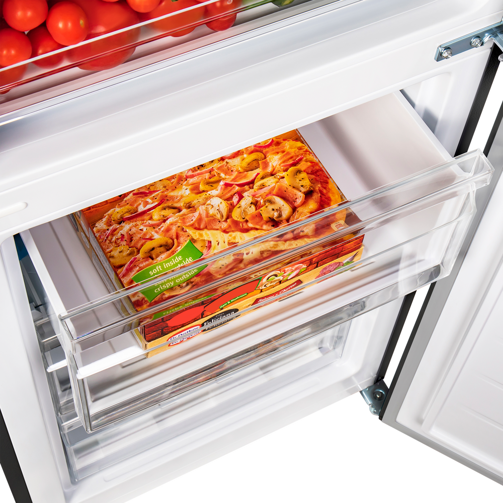 Двухкамерная конструкция с верхней холодильной (213 л) и нижней морозильной (104 л) камерами обеспечивает продуманную организацию хранения. В холодильном отделении предусмотрены стеклянные полки с металлической окантовкой, большая корзина для фруктов и овощей, боковые полки на дверце, решетка для бутылок и лотки для яиц. Низкий уровень шума 39 дБ делает MAUNFELD MFF185SFSB комфортным для кухни-гостиной.