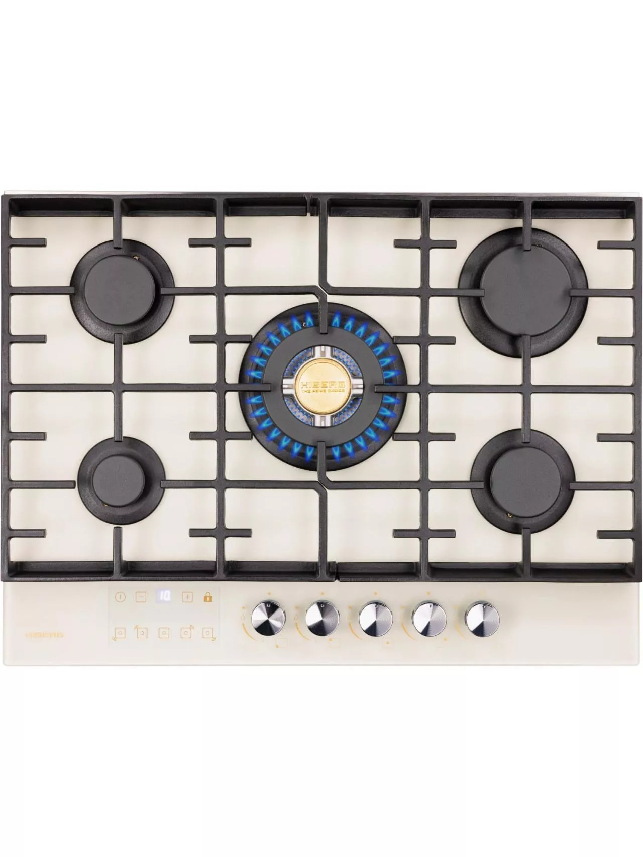 Пять конфорок газовой варочной панели отличаются диаметром и мощностью. Дополнительная горелка позволяет готовить еще больше блюд одновременно. Самая большая конфорка – WOK с тройным рядом пламени и мощностью 3,4 кВт. Усиленный жар способен быстро нагреть толстостенную глубокую посуду с небольшим диаметром дна для приготовления азиатской кухни. Также на ней можно быстро вскипятить воду, ускорить процесс жарки мясных и рыбных блюд до хрустящей корочки при добавлении небольшого количества жира.